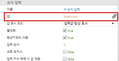 - SparkLine 태그를 생성된 스파크라인 그래프에 Smart bind (drag-and-drop) 합니다. 또한 SparkLine 태그를 숫자 필드에 연결하여 숫자가 조정되는 것을 확인합니다.
