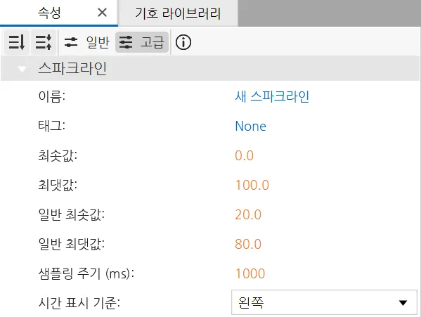 섹션 제목: “스파크라인 기본 속성”스파크라인의 기본 속성에는 최솟값, 최댓값, 샘플링 주기가 포함됩니다. 이러한 설정은 스파크라인의 범위와 샘플링 주기를 결정합니다. 시간 표시 기준을 통해 그래프의 흐름 방향(예: 왼쪽에서 오른쪽으로)을 설정할 수 있습니다.