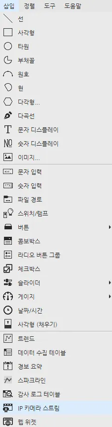 - 삽입 > IP 카메라 스트림에서 IP 카메라 스트림 오브젝트를 페이지로 드래그하세요.