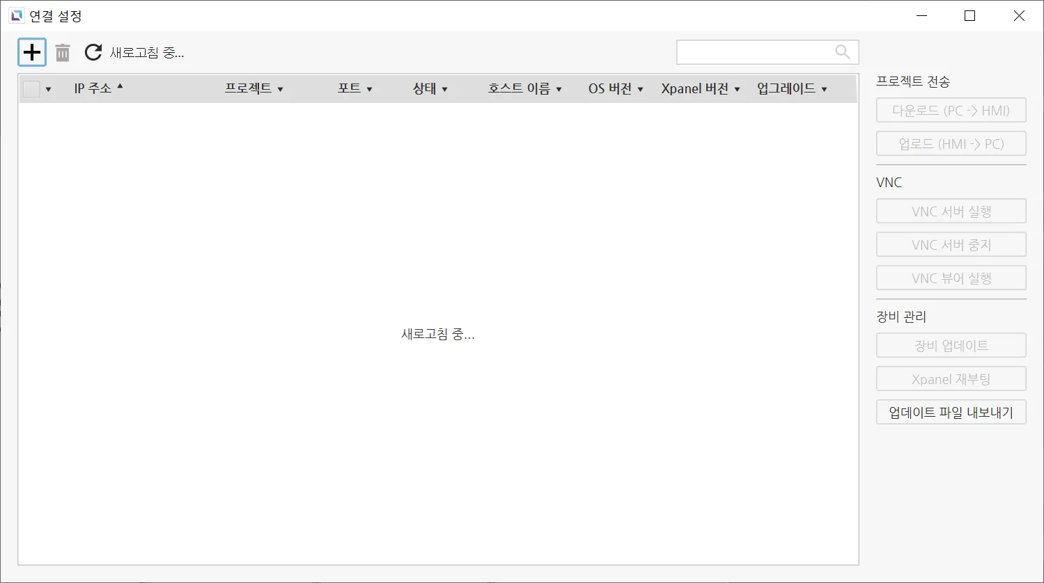 프로젝트를 런타임으로 전송하려면, 연결 설정 페이지에서 프로젝트에 사용할 HMI를 선택합니다. 선택하면 페이지 오른쪽에 있는 버튼들이 활성화됩니다.