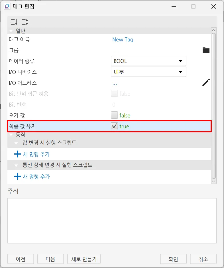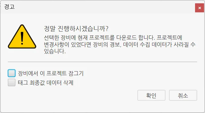 태그 최종값 데이터 삭제 옵션을 선택하면, HMI에 저장된 태그의 최종값 데이터가 삭제됩니다.