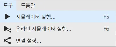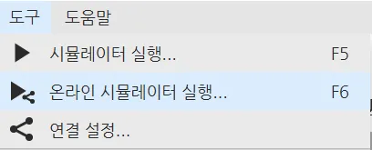 온라인 시뮬레이터를 실행하려면, 도구 > 온라인 시뮬레이터 실행으로 이동하거나 툴바의 온라인 시뮬레이터 실행 버튼을 클릭합니다. 오프라인 시뮬레이터에서는 사용할 수 없는 일부 기능이 온라인 시뮬레이터에서는 지원됩니다.