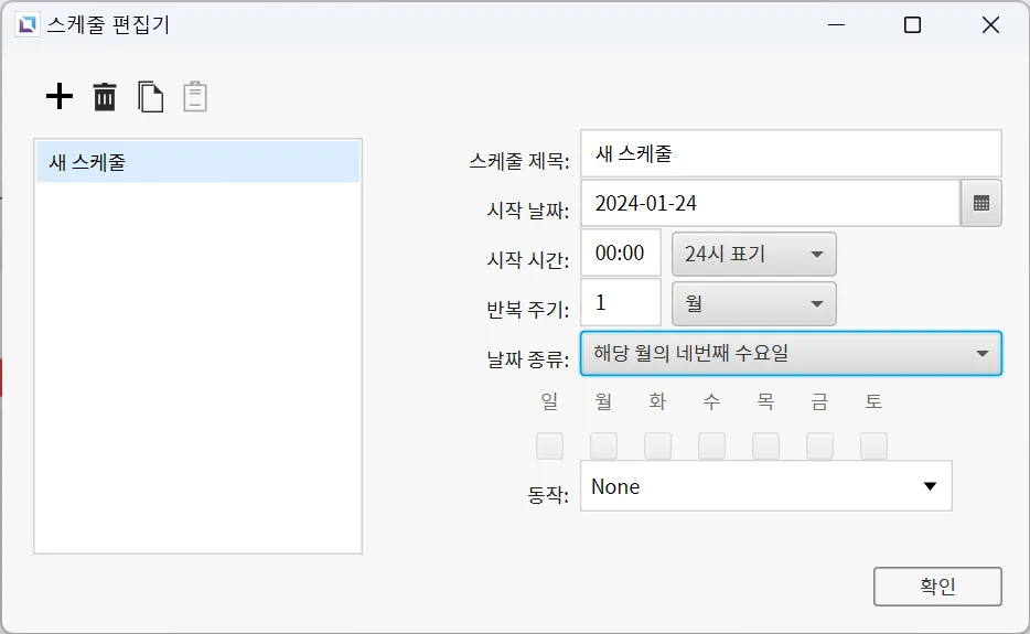 섹션 제목: “스케줄 편집기”도구 > 스케줄 편집기 또는 툴바에서 스케줄 편집기 열기… 를 클릭하여 스케줄 편집기를 열 수 있습니다. 스케줄 편집기에서는 사용자가 원하는 때에 지정한 동작이 수행되도록 스케줄을 추가, 수정 및 삭제를 할 수 있습니다. 사용자는 시작 날짜, 시작 시간, 반복 주기를 설정할 수 있습니다. 주 단위로 반복하는 기능의 경우 요일, 1개월 중 특정 날짜를 지정하는 식으로도 반복 주기를 더 구체적으로 지정할 수 있습니다. 모든 주기는 시작 날짜와 시작 시간으로부터 계산되며, 조건이 맞는 날 및 시간이 되면 지정된 동작을 수행합니다.