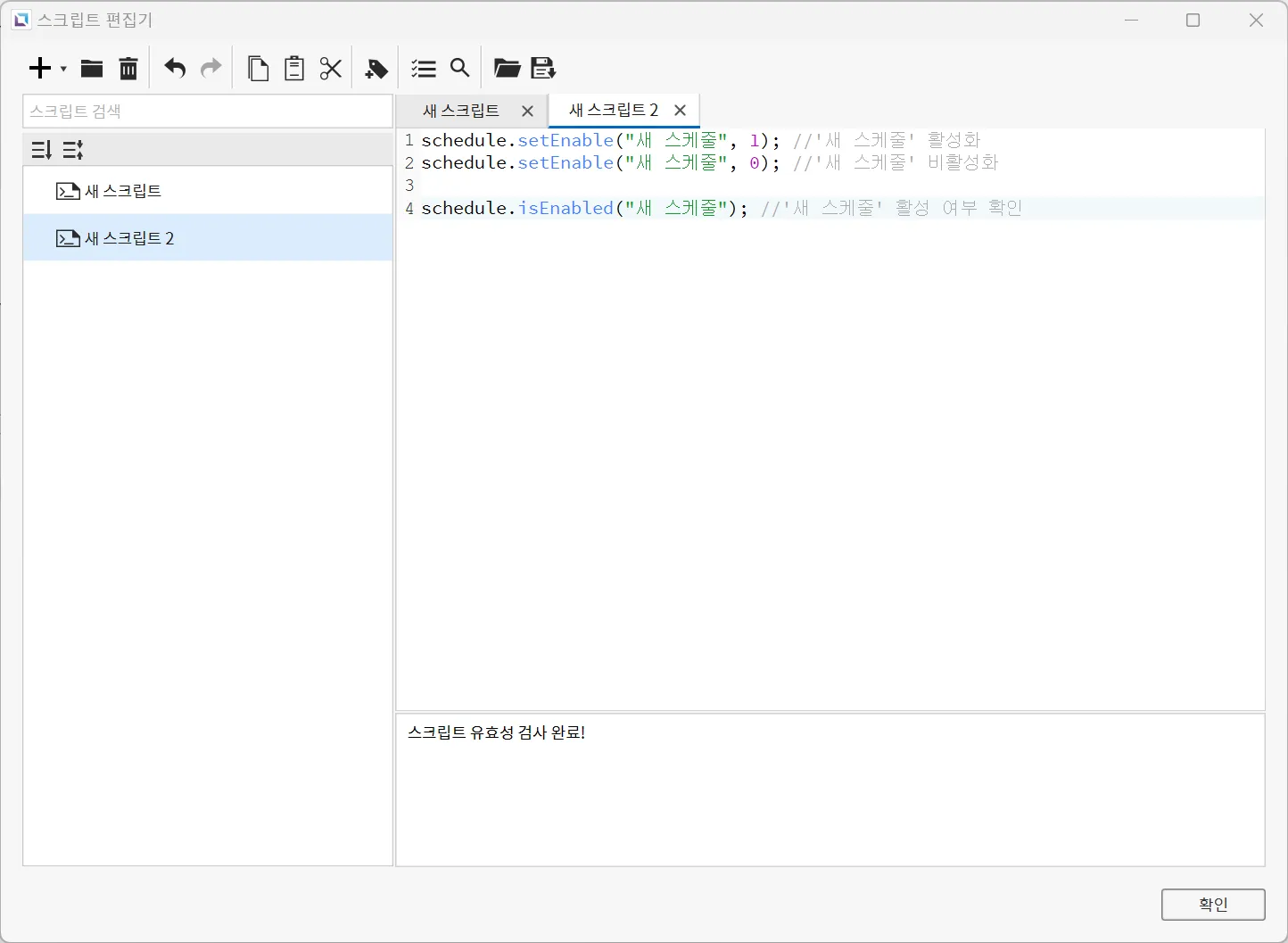 스크립트에서 schedule.isEnabled(ScheduleName) 함수를 이용하면 해당 스케줄의 활성화 상태를 확인할 수 있습니다.
