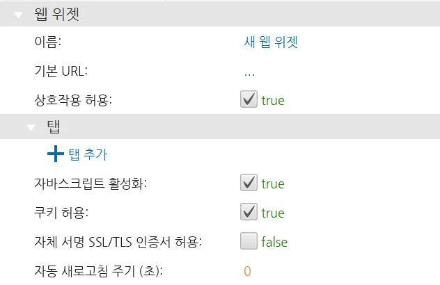 섹션 제목: “웹 위젯 구성”- 기본 URL 속성 필드에서 URL을 *https://google.com*으로 설정합니다. 이것이 기본 홈 주소가 됩니다.