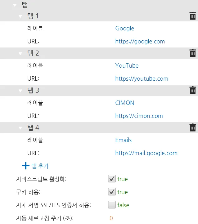 - 탭 추가 버튼을 클릭합니다. 지정된 레이블 및 URL로 여러 개의 다른 탭을 추가합니다.