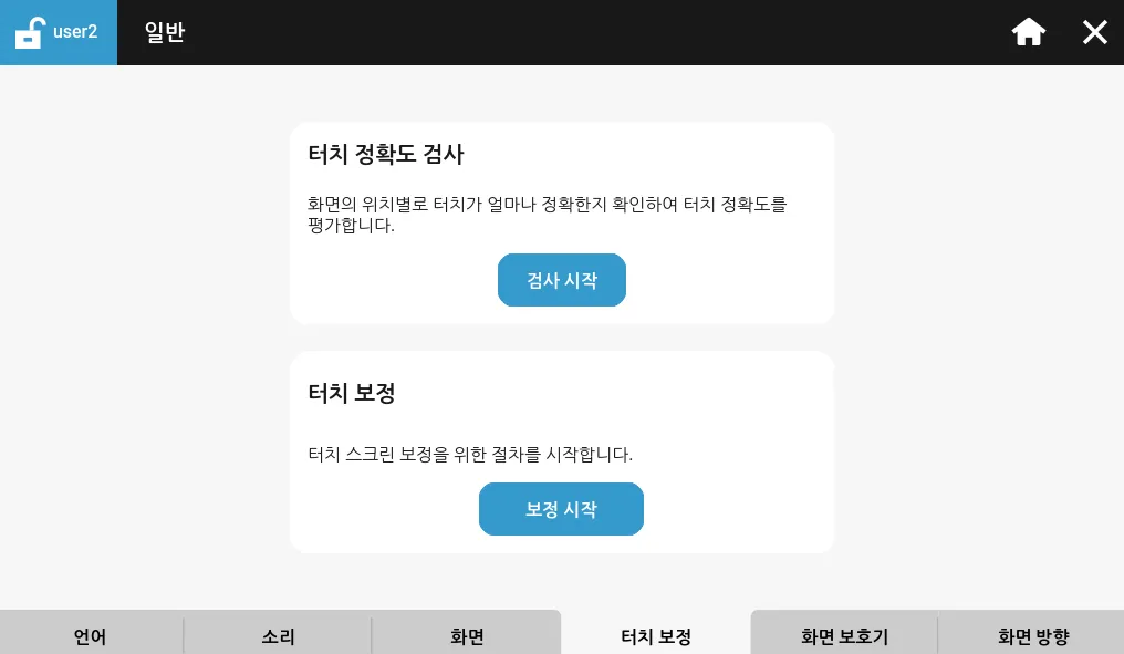 터치 보정 탭에서 터치 정확도 검사를 통해 화면에서의 터치 동작을 확인 할 수 있습니다. 정확하지 않은 경우에는 터치 보정 프로세스를 시작하여 현재의 터치 보정 값을 재설정할 수 있습니다.