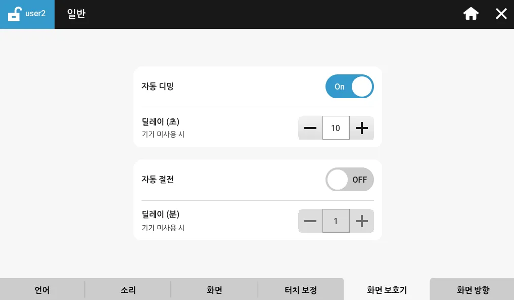 화면 보호기 탭은 Xpanel의 화면 밝기 조절 기능과 절전 모드 기능을 제어할 수 있습니다.
