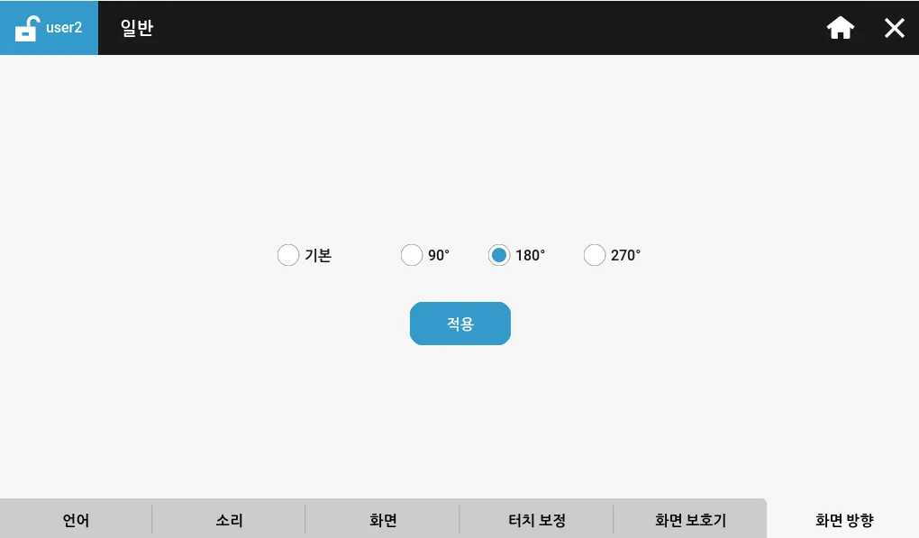 화면 방향 탭에서 사용자가 HMI 화면의 방향을 설정할 수 있습니다. 가로 방향의 경우 기본 또는 **180°**를 사용하고, 세로 방향은 90° 또는 **270°**를 사용하세요.