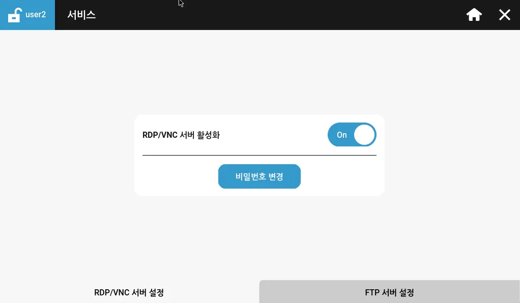 RDP/VNC 서버 설정 탭에서 RDP (eXT 시리즈) 와 VNC (eXT2 시리즈)를 활성화 하거나 비활성화 할 수 있으며, 비밀번호를 설정할 수 있습니다.