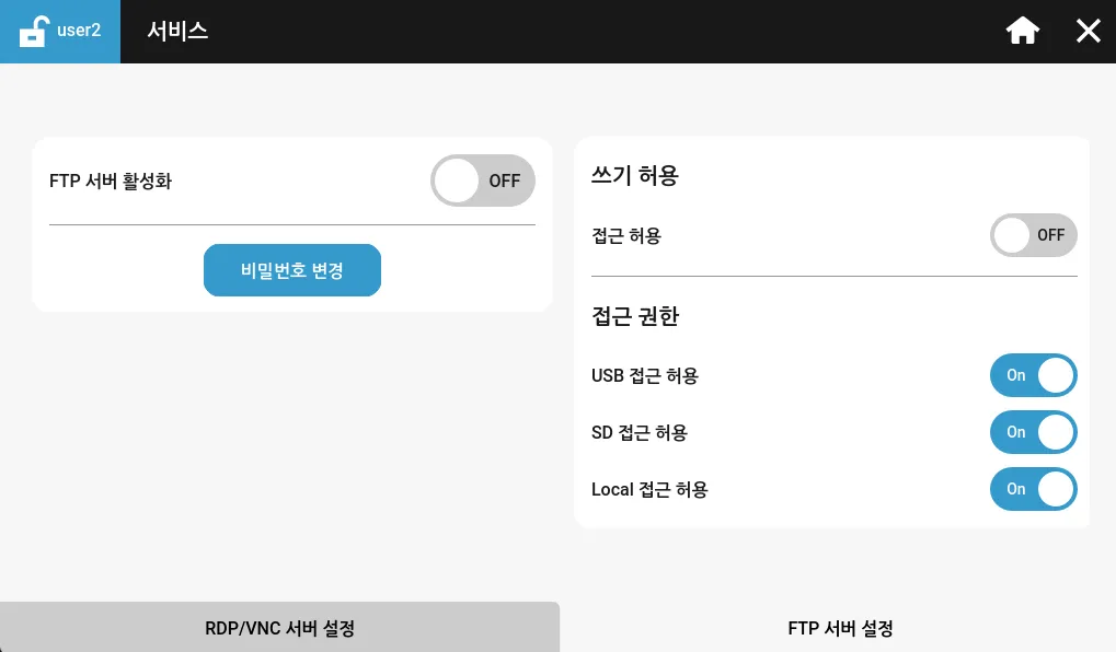 섹션 제목: “서비스”서비스 탭에서 RDP/VNC와 FTP 같은 원격 연결 기능을 켜거나 끌 수 있고, FTP는 세부 설정까지 할 수 있습니다.