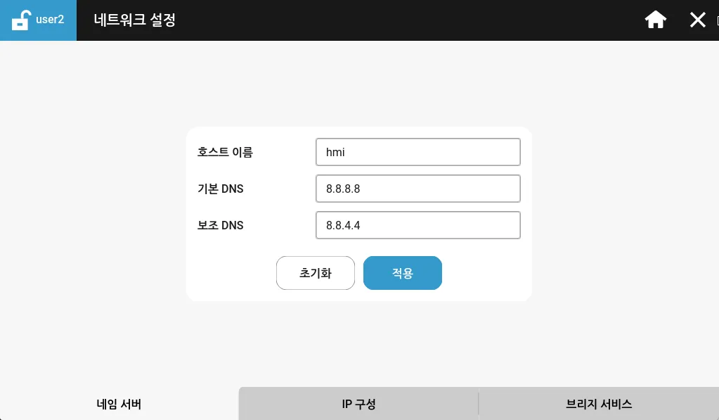 네임 서버 탭에서 네트워크에 표시되는 HMI의 호스트 이름을 설정할 수 있습니다. 또한, 기본 DNS 와 보조 DNS 서버를 설정할 수 있습니다.
