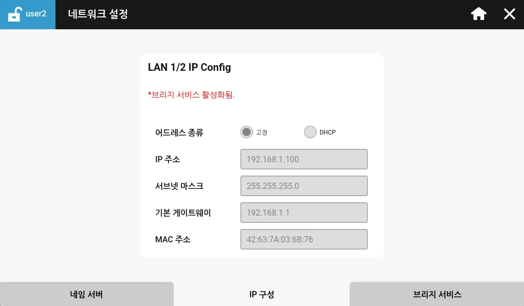 IP 구성 탭은 사용자가 Xpanel의 각 이더넷 포트에 대한 IP 주소, 서브넷 마스크, 기본 게이트웨이를 설정할 수 있도록 해줍니다. 이러한 옵션들은 어드레스 종류가 고정으로 설정된 경우에만 설정할 수 있습니다. DHCP로 설정되어 있다면 네트워크의 DHCP에 의해 IP 주소를 할당받게 됩니다.