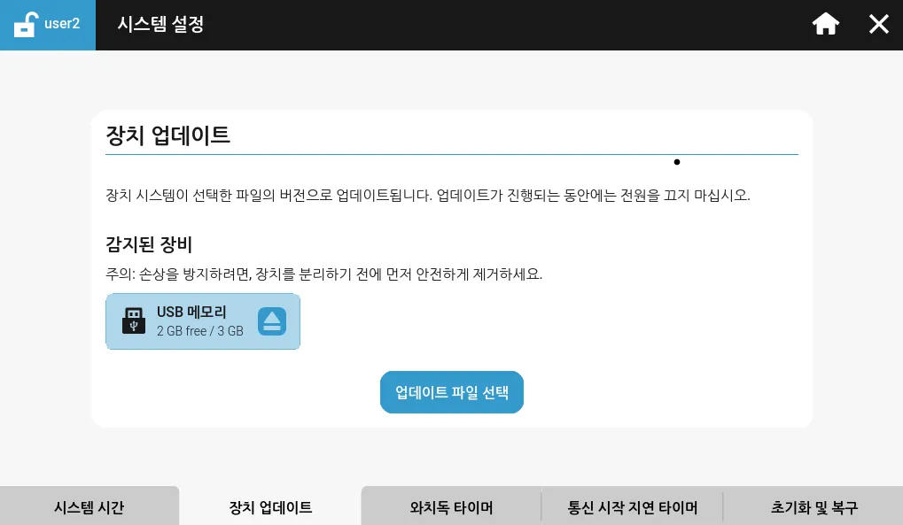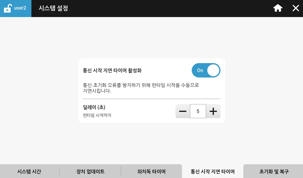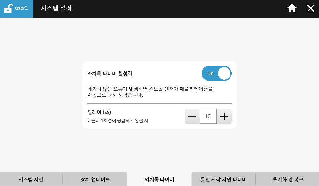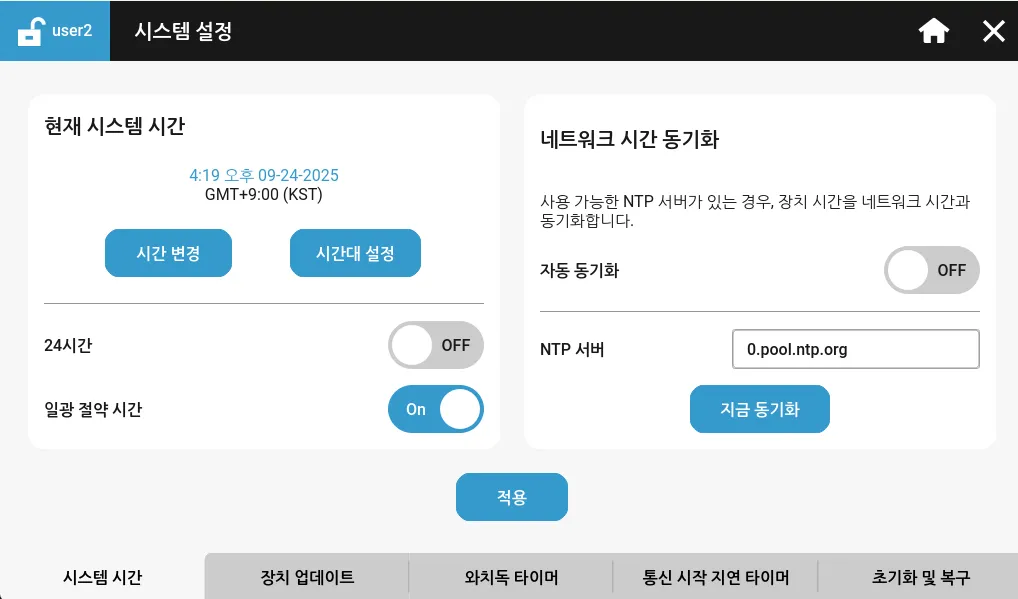 섹션 제목: “시스템 설정”시스템 설정에서 시스템 시간, 장치 업데이트, 와치독 타이머, 통신 시작 지연 타이머, 초기화 및 복구에 관한 설정을 할 수 있습니다.