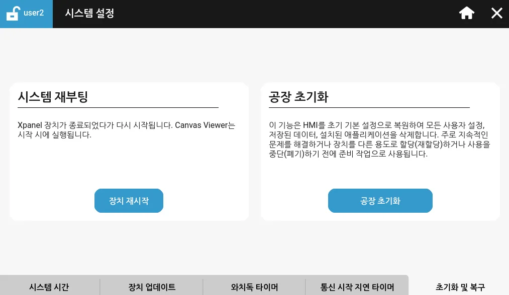초기화 및 복구 탭에서 사용자가 전원을 껐다가 다시 켤 필요 없이 HMI를 재부팅할 수 있도록 해줍니다. 또한, 문제 해결이나 장비 폐기를 위해 Xpanel을 공장 초기화할 수 있도록 허용합니다.