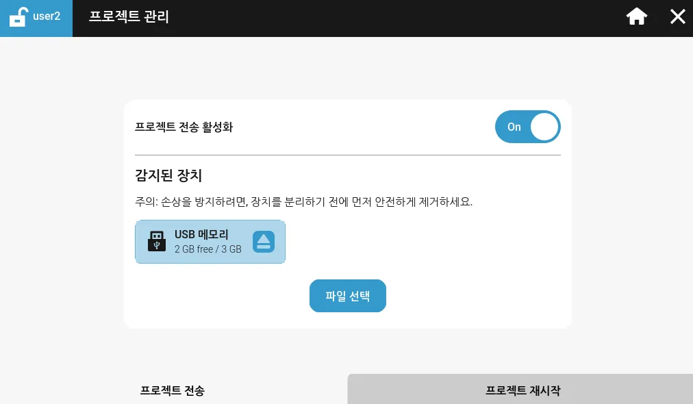 프로젝트 전송 탭에서 Xpanel 간의 프로젝트 전송을 활성화하거나 비활성화할 수 있습니다. 이 설정이 비활성화되면, 프로젝트가 Xpanel로 다운로드되는 것이 방지되며, 현재 Xpanel에 있는 프로젝트를 컴퓨터나 USB 또는 SD 카드와 같은 물리 저장 장치로 업로드하는 것도 방지됩니다.