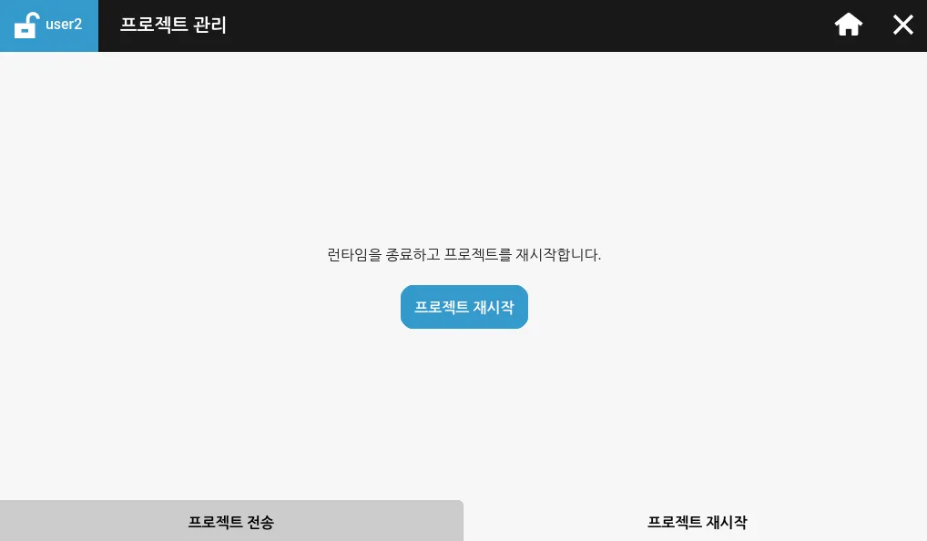 프로젝트 재시작 탭에서 현재 Xpanel에 다운로드된 프로젝트를 재시작할 수 있습니다. Xpanel의 전원이 처음 켜졌을 때나 프로젝트가 처음 다운로드되었을 때와 같은 기능을 합니다.