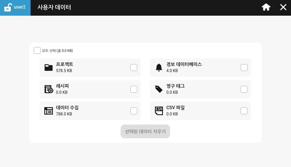 프로젝트, 레시피, 데이터 수집, 경보 데이터베이스, 영구 태그, and CSV 파일을 선택하여 삭제할 수 있습니다.