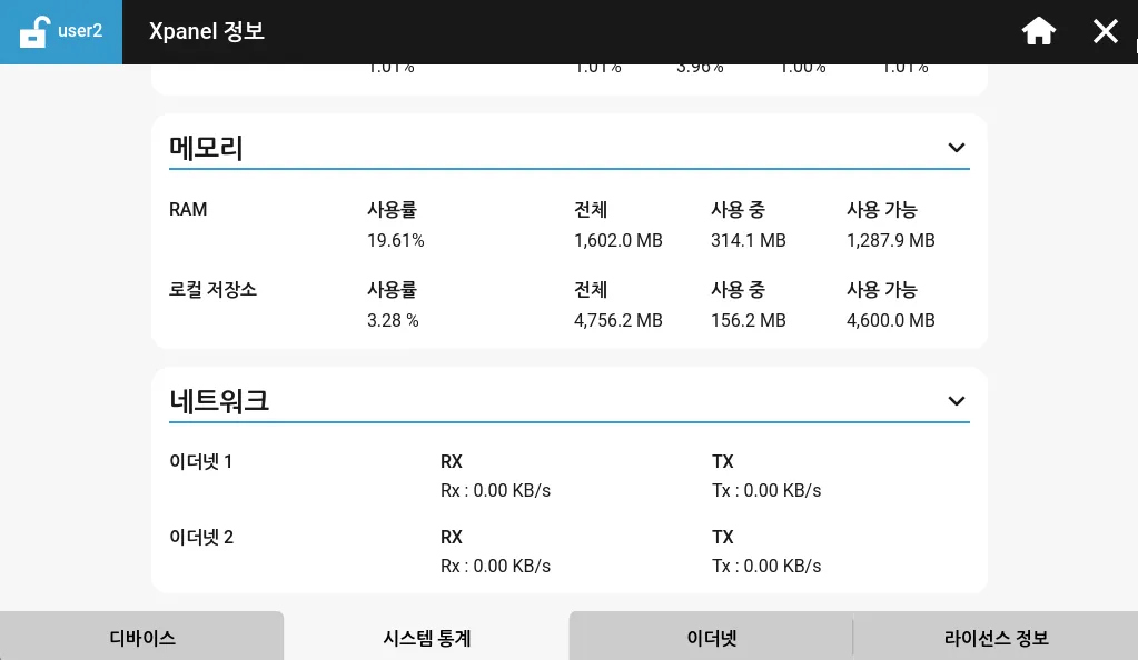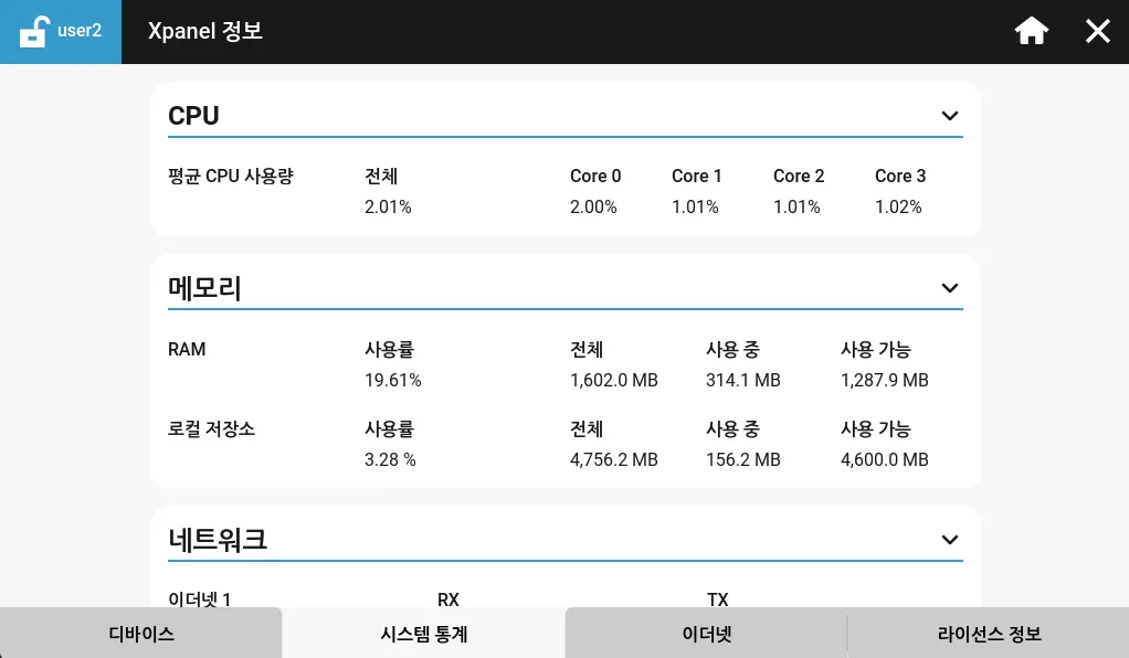 시스템 통계 탭은 Xpanel의 하드웨어 구성 요소에 대한 정보를 표시합니다. 여기에는 CPU 사용량, 메모리(RAM, 로컬 저장 공간) 사용량, 네트워크 전송 속도가 포함됩니다.