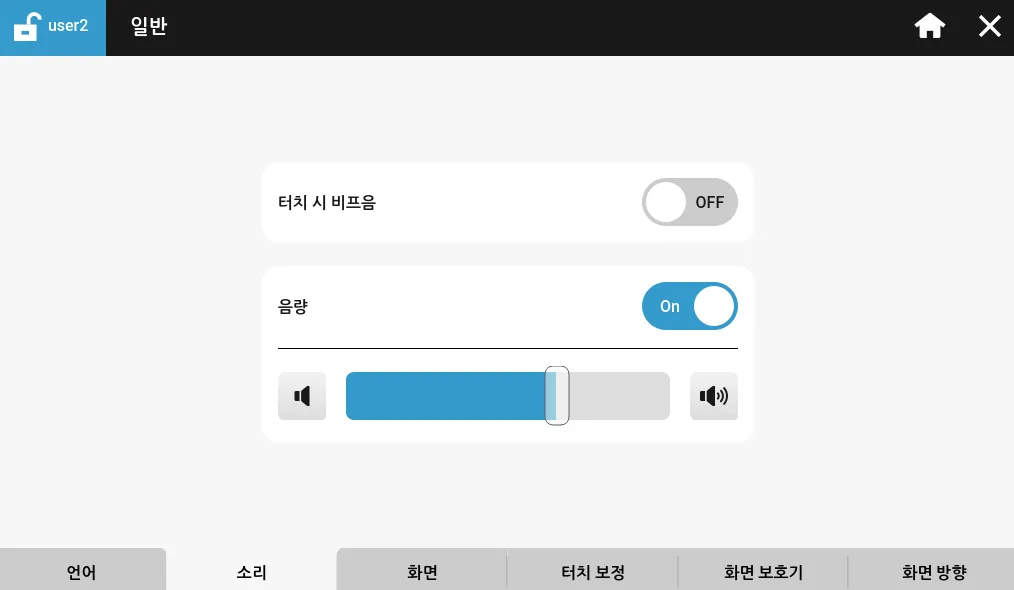 소리 탭은 Xpanel의 터치 시 비프음 및 음량을, 소리 크기를 제어합니다.