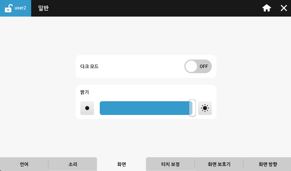 화면 탭은 사용자가 HMI 화면의 밝기를 변경하고 기본 보기 모드를 다크 모드로 변경할 수 있도록 해줍니다.