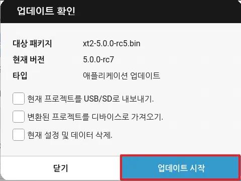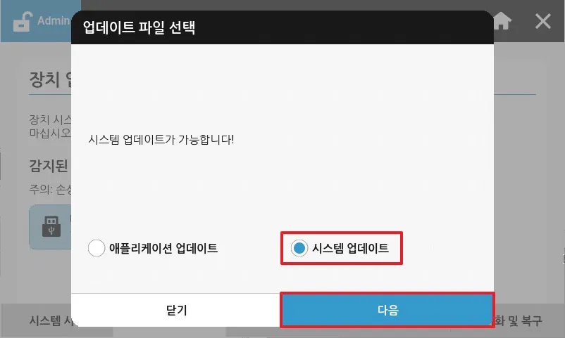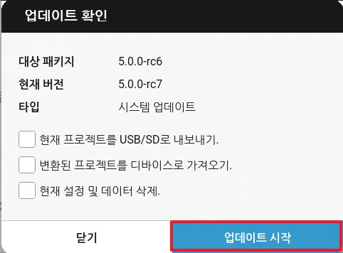 업데이트 시작을 눌러 시스템 업데이트를 시작합니다.