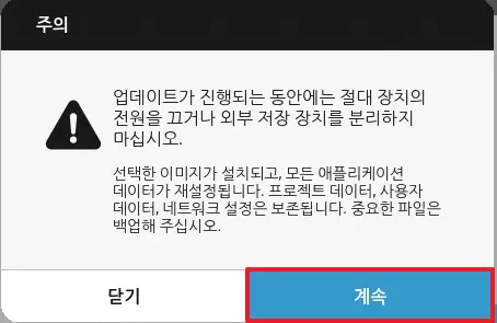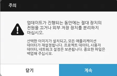 장비 업데이트 확인 창에서 OS와 Canvas 뷰어의 업데이트 변경사항을 확인할 수 있습니다. 업그레이드를 진행하려면 확인을 클릭합니다.