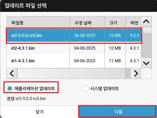 섹션 제목: “애플리케이션 업데이트”패치 버전과 마이너 버전 간에 업그레이드(예: 5.0.0 → 5.1.3)하려면, 애플리케이션 업데이트를 선택하고 업데이트에 사용할 BIN 파일을 선택한 다음 다음를 선택하세요.
