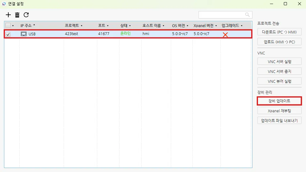 Canvas에서 Xpanel을 업데이트하려면, 도구 > 연결 설정에 진입하여 목록에서 대상 장치를 선택한 후 장치 업데이트를 클릭하세요.