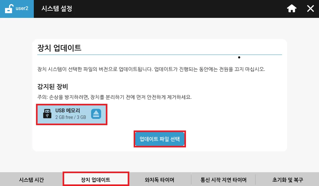 장치 업데이트탭으로 이동합니다. USB 또는 SD 카드를 Xpanel에 삽입한 후, 감지된 장비를 클릭하고 업데이트 파일 선택을 선택합니다.