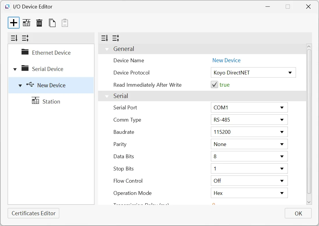 Section titled “Koyo DirectNET”Canvas supports Koyo DirectNET as a way to connect to devices that support this protocol. Users can configure the Operation Mode.