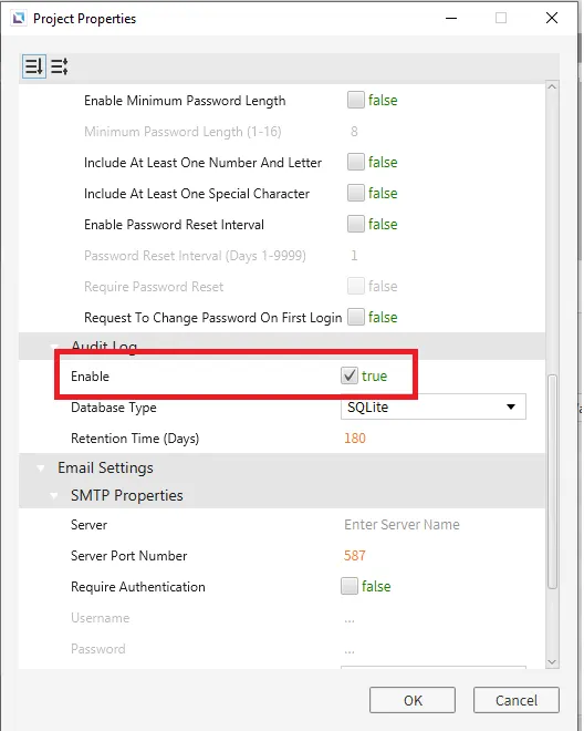 Section titled “Audit Log Designer Functionalities”Users must first enable the audit logger in the Project Properties to set up the audit log table. To do this, go to File > Project Properties, scroll to Audit Log, and check Enable. 1