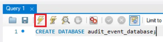 CREATE DATABASE audit_event_database;. To do this, enter the command in the Query 1 text area, then press the lightning button to execute it.