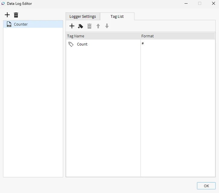 Section titled “Data Logger Model Configuration 1”- Create the following data logger model under Tools > Data Log Editor: