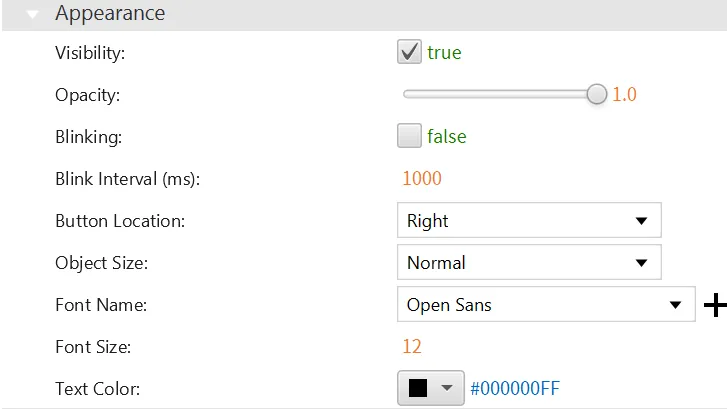 Section titled “Appearance”The Appearance section enables users to adjust colors, layout, and visual characteristics, including button location and object size.