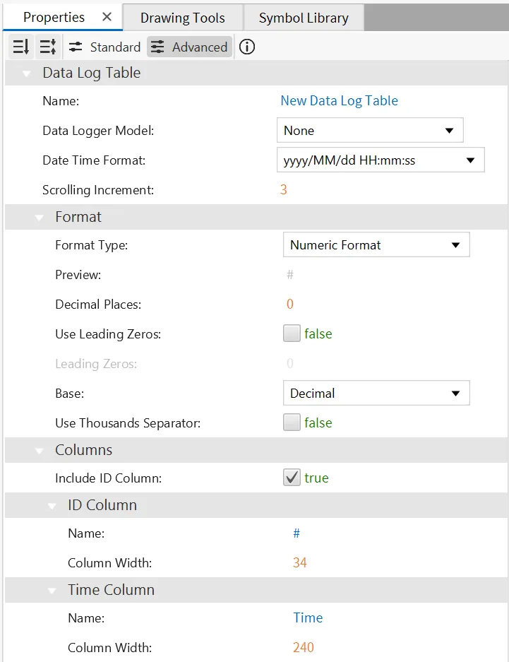 Section titled “Properties”The Data Log Table object can be customized based on specific properties.