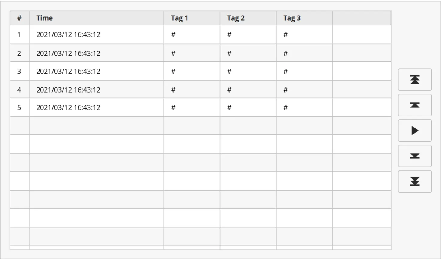 Section titled “Data Log Table”Click Insert > Data Log Table, or the Insert Data Log Table on the toolbar, to insert a data log table. Once selected, click and drag to the desired size. It also allows users to pause/play and scroll up/down the logs in runtime using the buttons. The table will look like the image below: