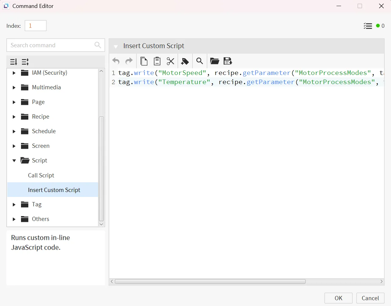 tag.write("MotorSpeed", recipe.getParameter("MotorProcessModes", tag.read("RecipeID"), 0));tag.write("Temperature", recipe.getParameter("MotorProcessModes", tag.read("RecipeID"), 1));