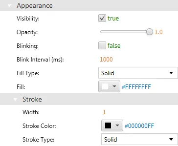 Section titled “Appearance”The Appearance settings section allows customization of visibility, opacity, and blinking options. It also provides controls for setting the fill type, color, start angle, arc angle, and stroke properties, such as width, color, and stroke style.