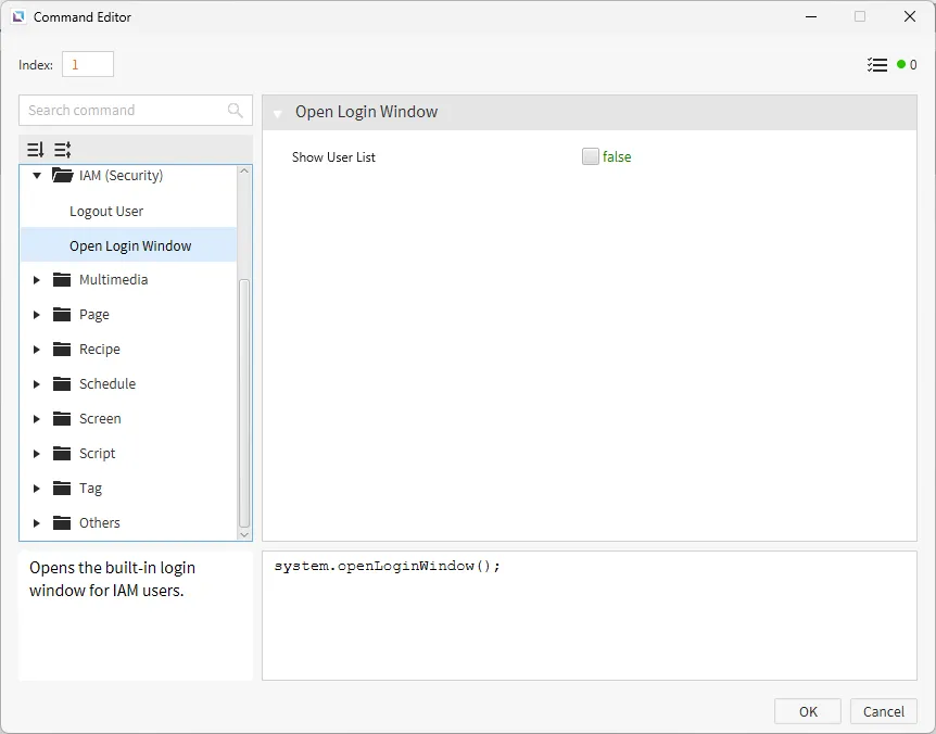 Section titled “Identity and Access Management Runtime Functionalities”When permissions, users, and groups are set, specific objects will not be available during runtime if they require specific permission to run. Users can access these permissions with the login function.