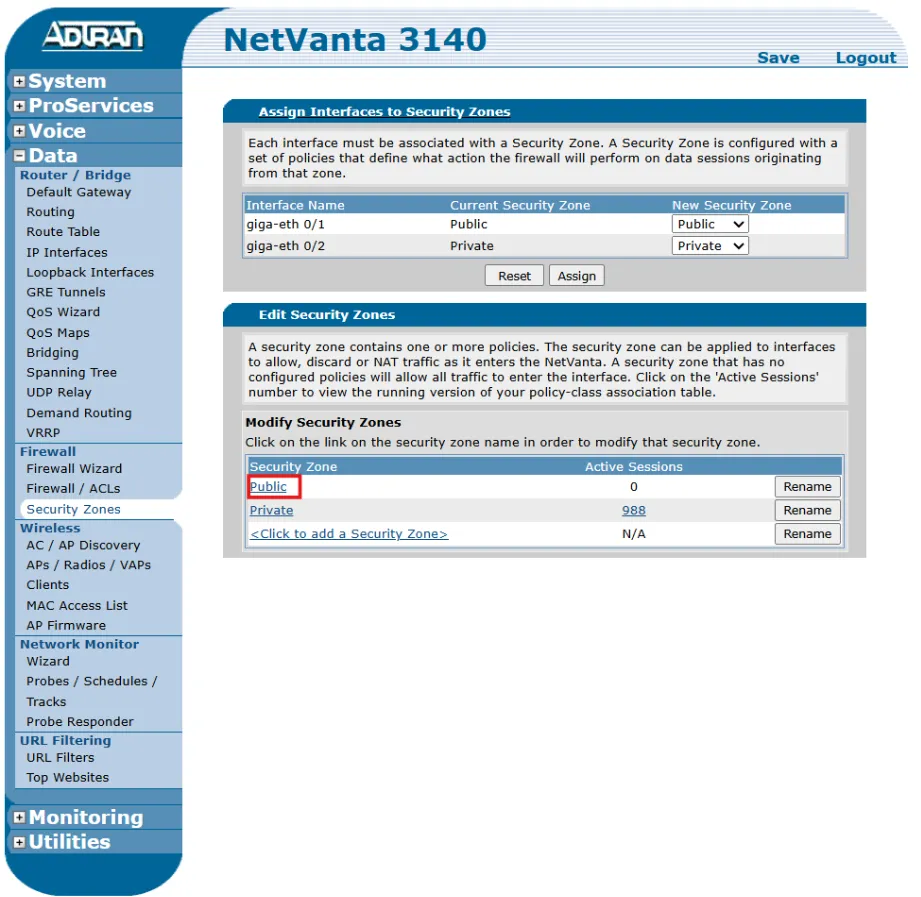 - Navigate to Security Zones. On the router's homepage, click on: Data > Router / Bridge > Firewall > Security Zones.