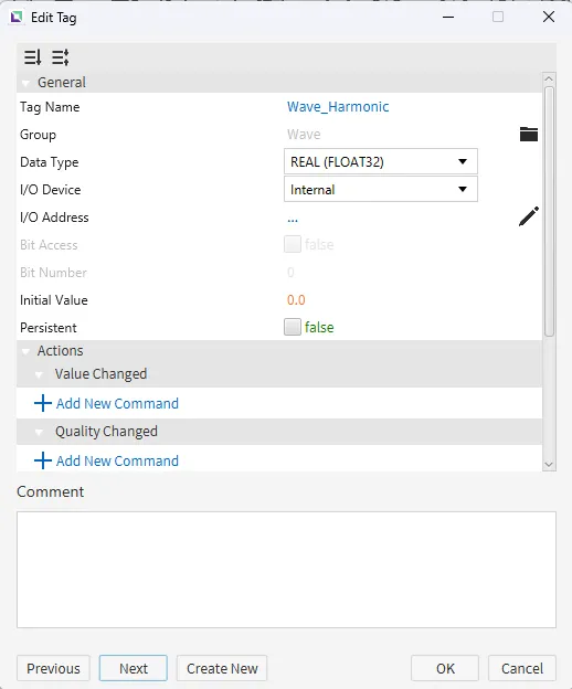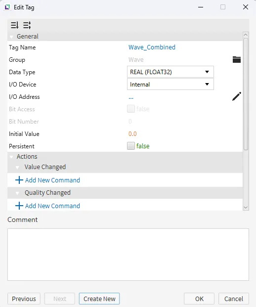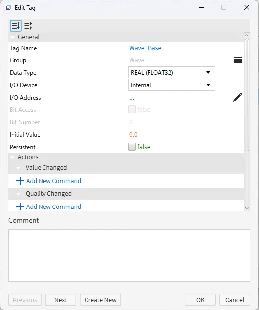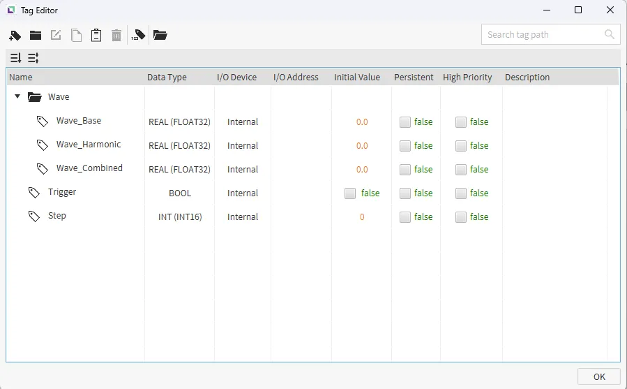Section titled “Tag Configuration”- Create a tag group named Wave, and add the following tags:
