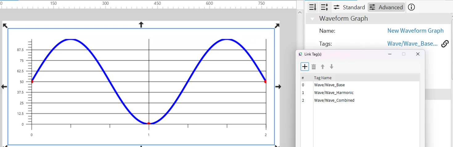 Section titled “Waveform Graph Configuration”- Bind Pens: Drag the Wave tag group onto the graph to include all three signals. Set visual properties: