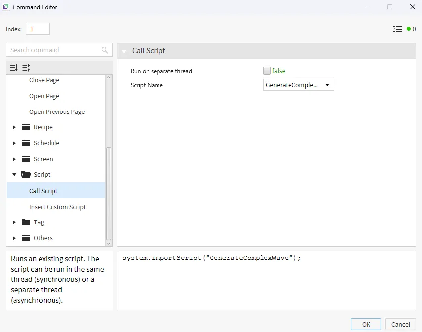 - Select the Script > Call Script command and call the GenerateComplexWave script.