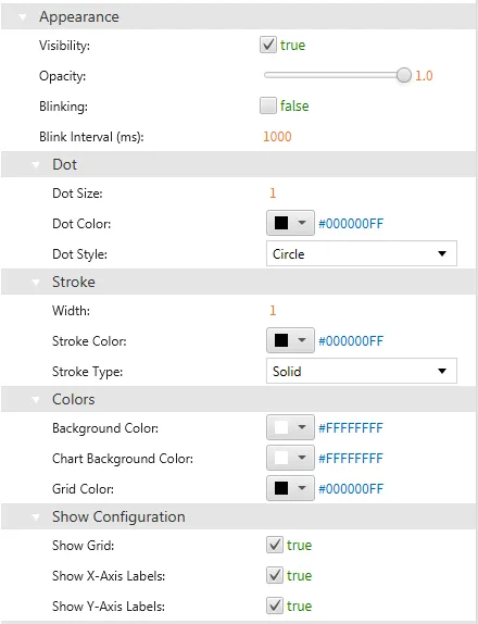 Section titled “Appearance”The Appearance section allows users to adjust the graph’s visual settings, including visibility, opacity, dot style, stroke width, stroke type, and display options such as grid lines and axis labels.