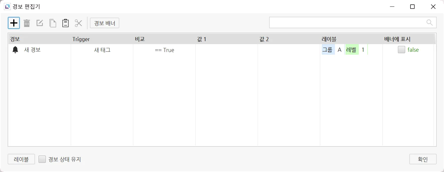 이 창에서는 프로젝트 내에 생성된 모든 경보의 이름, 발생 조건, 비교 조건, 비교에 사용되는 값, 레이블, 배너 표시 여부가 표시됩니다. 여기서 사용자는 원하는 경보를 추가, 수정, 복사, 붙여넣기 및 삭제를 할 수 있습니다.