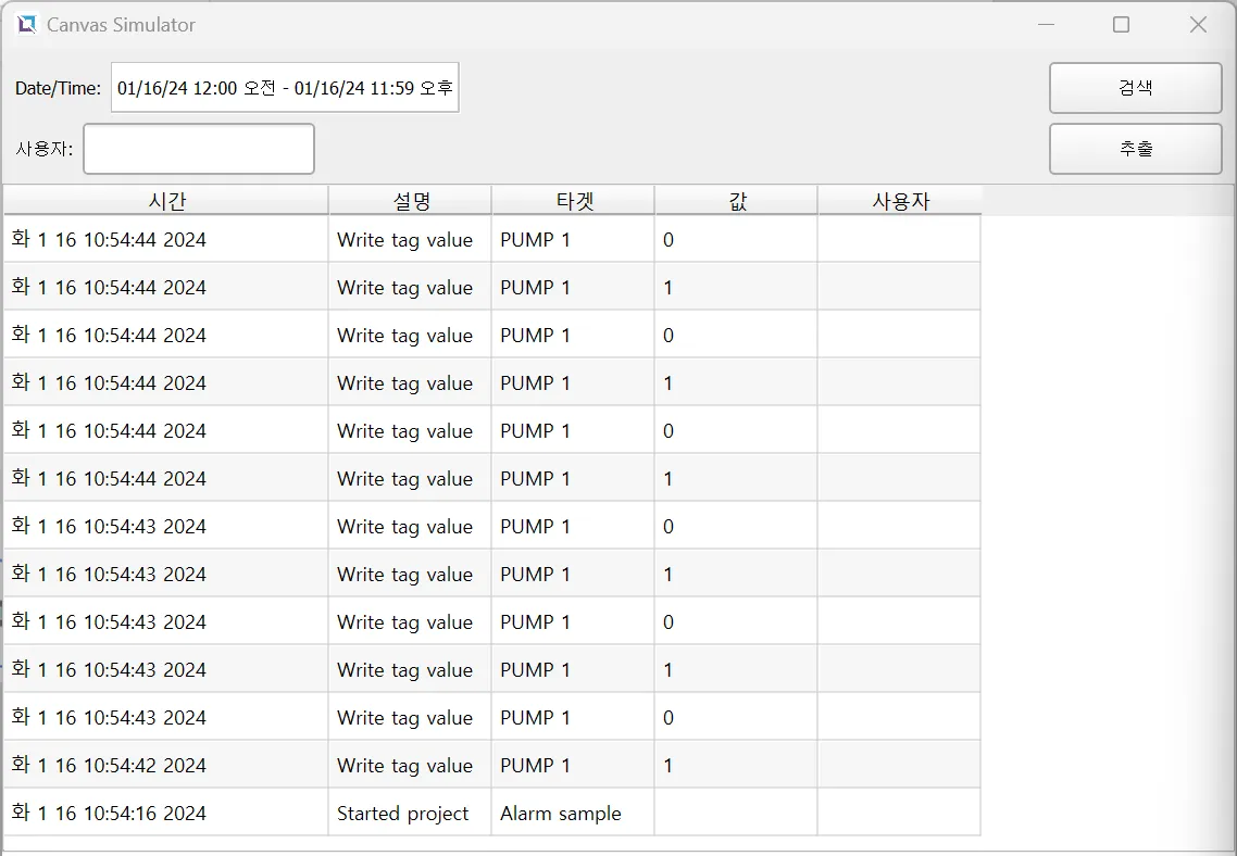 섹션 제목: “기능 설명”감사 로그는 런타임 실행 중 발생하는 모든 사용자 동작을 추적합니다. 태그 값 변경, 로그인 등과 같은 사용자 동작이 감사 로그에 기록됩니다. 이러한 기록은 발생 시간, 동작 설명, 대상, 값 그리고 수행 사용자의 내용으로 구성됩니다.