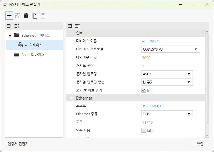 섹션 제목: “Ethernet 디바이스”Ethernet 디바이스는 다른 디바이스와 Ethernet 연결을 통해 접속할 때 사용됩니다. 사용자는 연결할 디바이스의 IP 주소와 Ethernet 종류, 포트를 입력해야 합니다. 선택한 프로토콜에 따라PLC 종류를 설정할 수 있습니다. 문자열 인코딩과 문자열 인코딩 방식도 선택 가능합니다. 이 외에도 타임아웃 시간과 재시도 횟수같은 다른 설정들도 구성할 수 있으며, 디바이스의 이름과 통신 프로토콜도 변경할 수 있습니다.