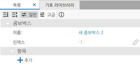 섹션 제목: “기본 속성”기본 속성 섹션에서는 사용자가 콤보박스 오브젝트의 이름, 인덱스 값, 선택 항목을 변경할 수 있습니다.