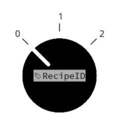 - 다이얼 오브젝트를 삽입합니다. 다이얼 오브젝트의 속성 아래에서 RecipeID를 값에 바인딩하고 총 3개의 값이 되도록 2개의 값을 더 추가합니다. 각 값에 해당하는 인덱스 값으로 레이블을 지정합니다.